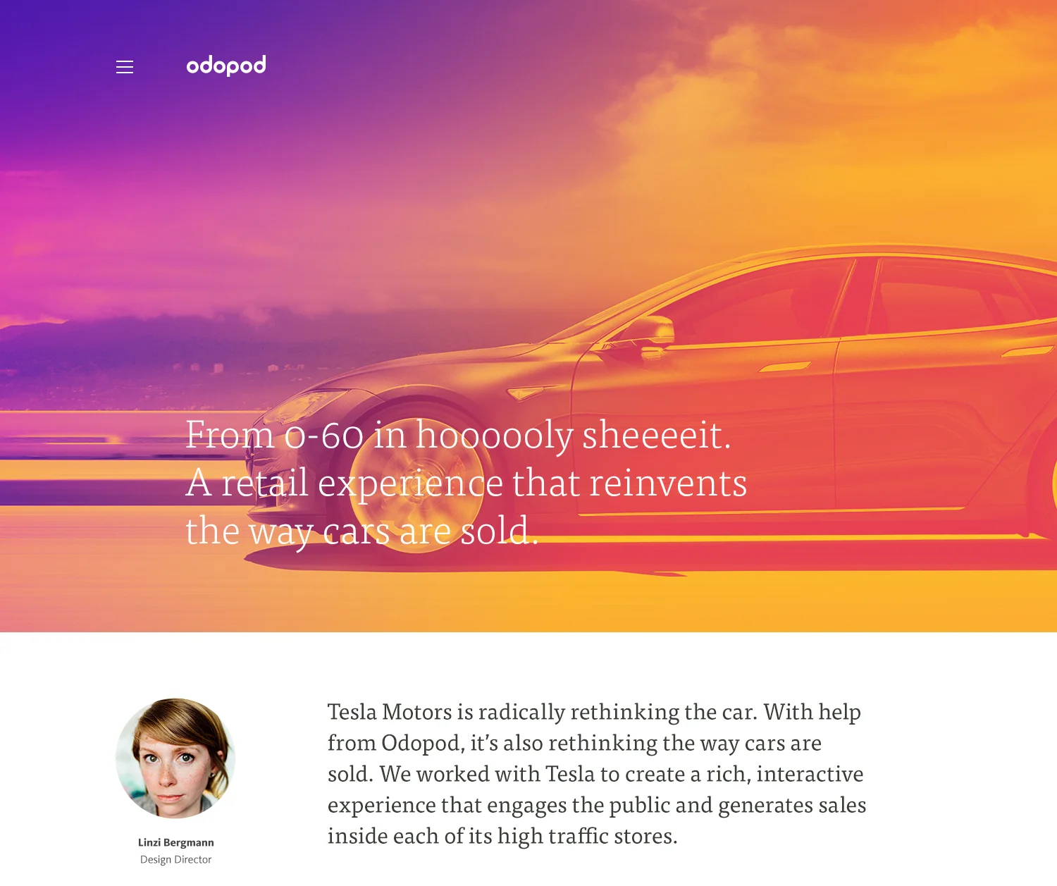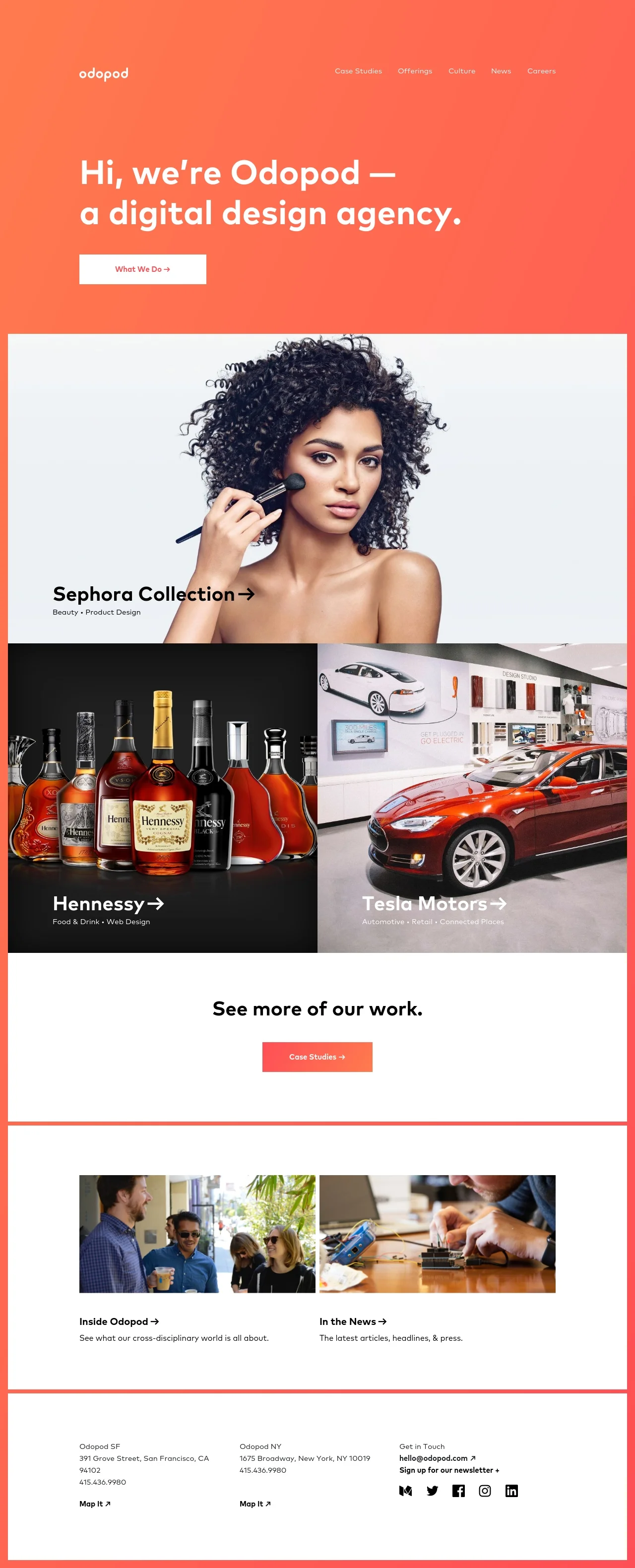 In the end, radical simplicity won the day. It was important we not distract from the quality of the work with a flashy page. Instead we focused on bold color, typography and thoughtful imagery to tell the real Odopod story.